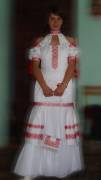 Продам весільну сукню.Сучасний, модний силует гармонійно поєднаний з мотивами традиційного українського костюма. Основні тканини – атлас і шифон. Оздоблення – ручна вишивка бісером і паєтками за спеціально розробленими схемами. Сукня нова, ще не використовувалась. Вона стала втіленням дизайнерської розробки, на яку мене надихнула дослідницька робота над давнім українським одягом. Доповнена вишиваною сумочкою та наручною прикрасою з бісеру. Розмір – 44-46. Якщо вас зацікавить сукня, можу запропонувати виготовлення предметів весільного вбрання, аксесуарів у відповідному стилі для нареченого та інших важливих учасників весільного дійства. |
