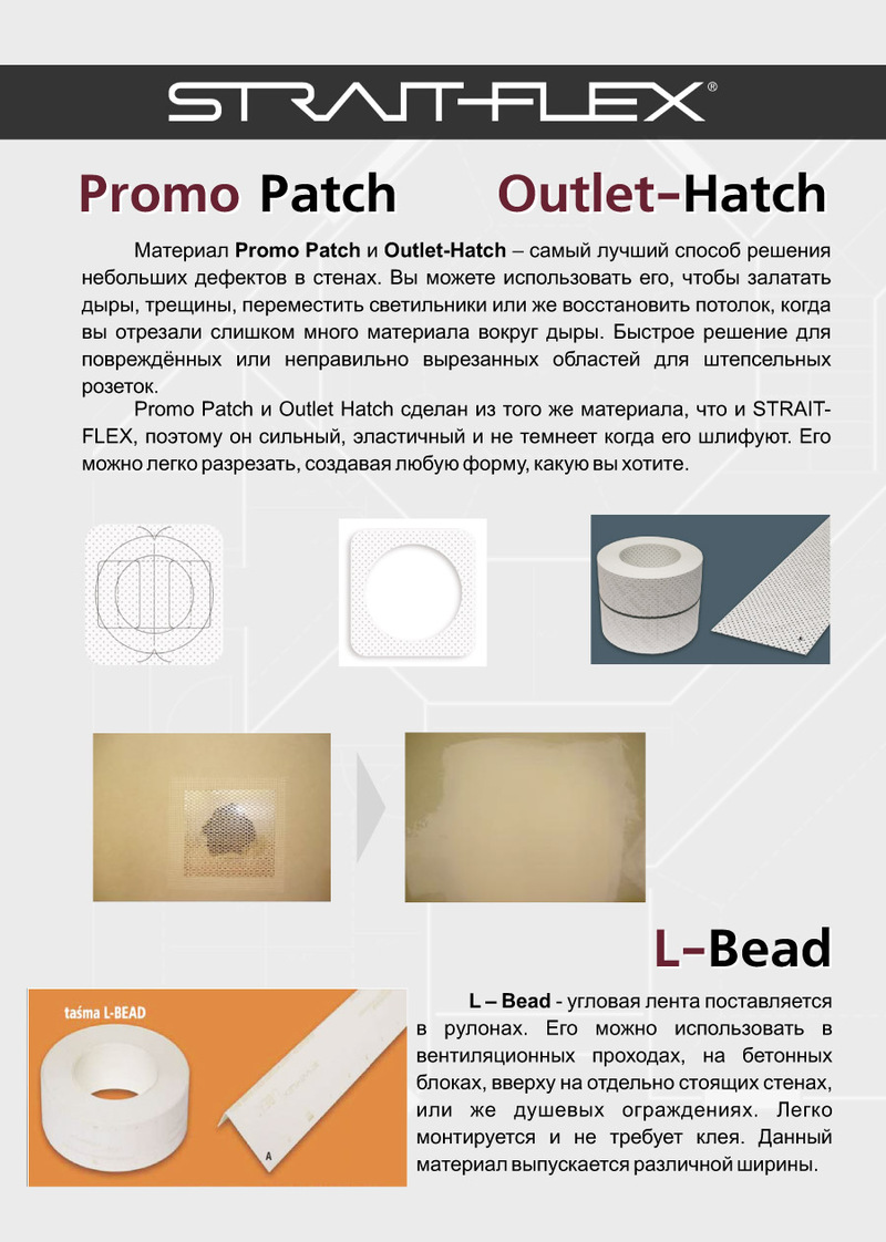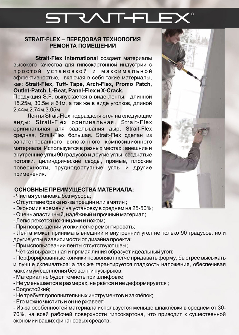 Предлагаем вашему вниманию инновационные материалы Strait-Flex для гипсокартонных систем (ленты, уголки, заплатки). С материалом от Strait-Flex в результате выполнения ремонтных работ, вы существенно сэкономите финансовые средства, получив ремонт более высокого качества. В результате используется меньше шпаклёвки в среднем от 30-70% на всей рабочей поверхности гипсокартона и экономия времени до 50% на данном этапе работы, что приводит к существенной экономии ваших финансовых средств. Strait-Flex – Просто, легко, быстро, экономично! Более подробная информация на нашем сайте: ncpeukraine.com.ua |