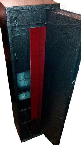 Размеры сейфа 1470*330*250 (высота*ширина*глубина) Размеры можно изменить. Сейф покрашен порошковой краской, цвет - серый антик, черный или серый. Становятся два ружья высотой до 1370 мм. Внутри обшит красным ковролином. Вес 38 кг. |