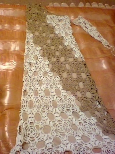 очень красивое вязаное платье (крючком).на одно плечо.и с одним съёмным рукавом.Всю красоту фото не передаст нити с нежным люрексом.узор богат и прекрасен.Цвет: бежевый и молочный.Платье длинное прекрасно сидит по фигуре.Состояние: отличное надевалось 1 раз на мероприятие.Размер:48.К платью прилагается основа( ткань масло. телесного цвета).Вы будете не отразимы в нём.Такого нет больше!!! |