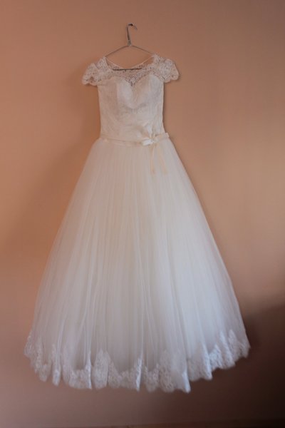 Весільна сукня, колір айворі (молочний). Спідниця 7-ми шарова, верхній шар - тонка євросітка. Корсет обшитий французьким мереживом, на спині коректується шнуруванням. Елегантний тоненький пасок. Сукня надзвичайно елегантна і зручна, дуже якісне пошиття під замовлення. Сукня в хорошому стані, жодних плям, затяжок. Після єврохімчистки. Розмір - L, на зріст 164 см + 9 см каблук. Рукавички в подарунок |