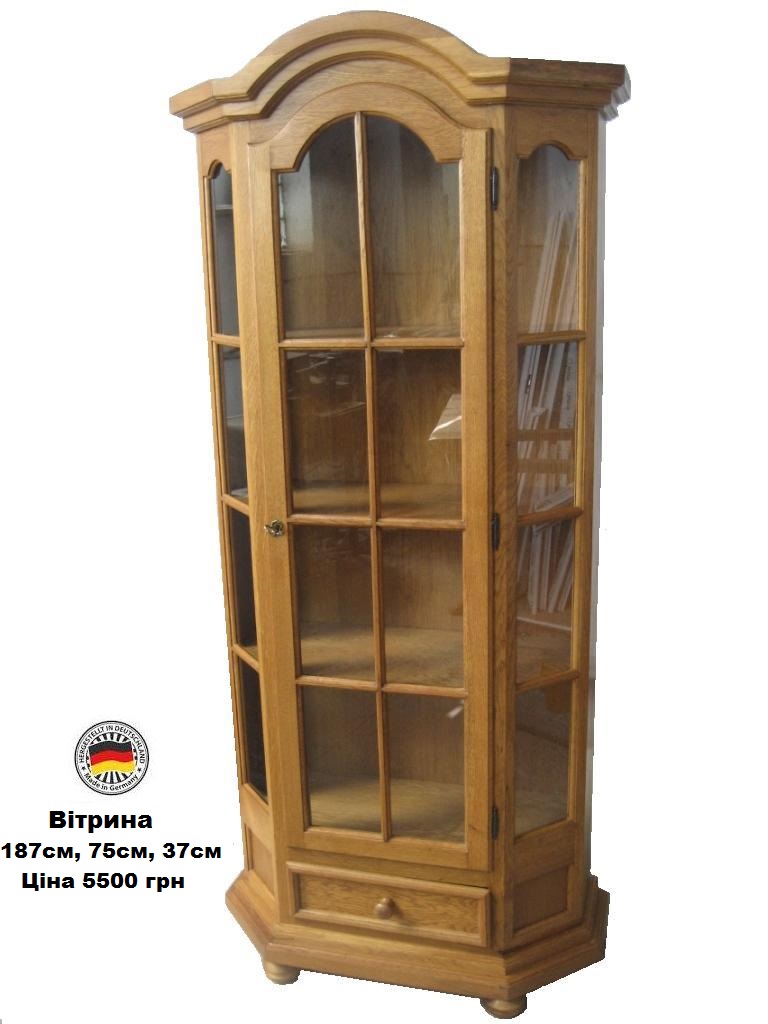 Вітрина привезена з Німеччини. Має такі розміри: висота 187 см, ширина 75 см, глибина 37 см. |