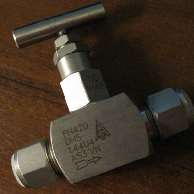 Вентиль игольчатый для макс. раб. давления 700 бар (10.000 psi) (производство Германия Schneider) из нержавеющей стали, новый (PN420, DN5, 1.4404, AS3 VN). |