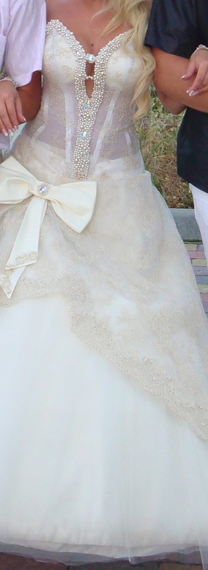 Шикарна Весільна сукня фірми "Miss KeLLy" (Франція) 2009р., в ідеальному стані, світло бежевого кольору, корсет: прозорий шифон оздобленний перлинами та вишивкою ручної роботи, низ атлас з шифоном, верхній шар вишивка.В комплекті є манжети на зап"ястя. |