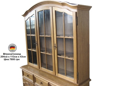 Продам комплект:комод з вітриною привезені з Німеччини. Матеріал: фасад з дерева,решта дсп,дубовий шпон. Загальні розміри: ширина 113 см,висота 204 см, глибина 43 см. |
