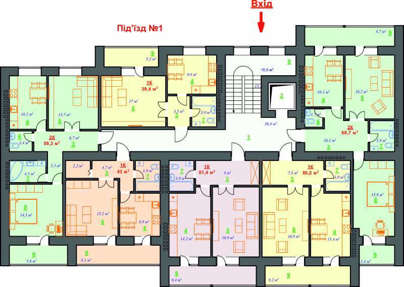 - квартири однокімнатні 36-55 м2;