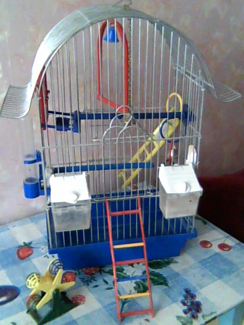 Красивая клетка , в хорошем состоянии , перелагается качелька , жордочки , пойка , кормушки , зеркальца , лесенки , и другие игрушки для попугая . |